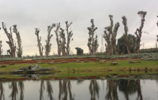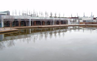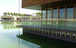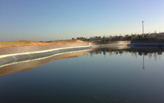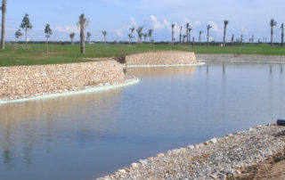 Embalses y lagos: Se definen en el proyecto todos aquellos elementos que intervienen en el almacenamiento del agua destinada al riego, y la interconexión entre los distintos puntos de recogida. Se distinguen los lagos decorativos y estratégicos situados en el interior del campo de golf y las balsas de reserva localizadas generalmente en zonas no afectadas visualmente desde el mismo. Todo el diseño de la red de drenaje está pensada para la recuperación de las aguas de lluvia y su conducción hasta las balsas de reserva y su aprovechamiento posterior en el riego de la instalación.