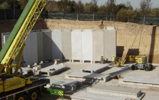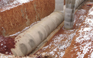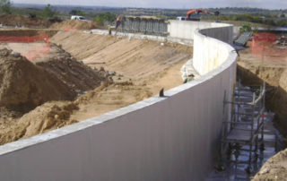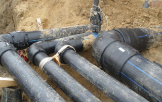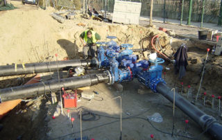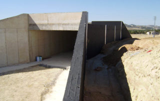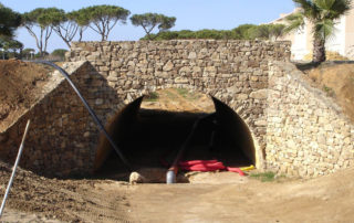 Redes Principales de drenaje: Consideramos dentro de este grupo aquellas canalizaciones formadas por tuberías de gran diámetro o marcos para la evacuación de aguas pluviales, que por lo general se encuentran a profundidades medias y deben de ejecutarse en coordinación con las labores de movimiento de tierras para reducir el coste de las excavaciones. Constituyen las arterias principales de transporte de agua de lluvia y su función es la de conducirla a lugares de almacenamiento para el riego posterior o evacuación fuera de la finca. En nuestros proyectos se presentan los planos con la alineación de los colectores, perfiles longitudinales con su rasante y pendiente de diseño correspondiente y los diámetros propuestos para cada tramo. En el cálculo se definen las velocidades máximas de circulación y el caudal máximo desaguado en su recorrido. De todo ello se extraen unas mediciones pormenorizadas que servirán como base para la licitación posterior y la definición de los pozos de registro, resalto y ciegos, así como las boquillas y obras especiales necesarias para su reintegro a los cauces o balsas de almacenamiento.